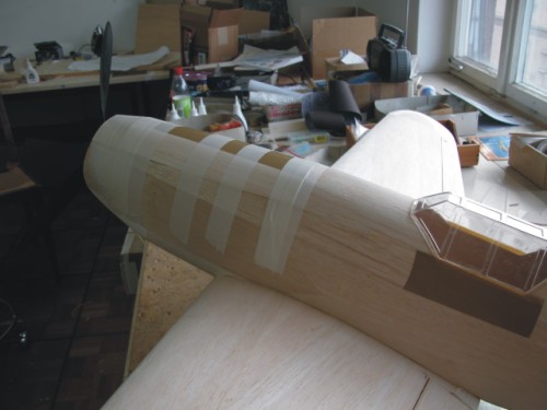 | Samstag und kein Flugwetter. Also wird an der großen Messerschmidt die vordere Rumpfabdeckung hergestellt. Ein Deckel aus Vollbalsa wird etwas zu schwer. Daher werden einige Spanten aus Pappelsperrholz hergestellt und zusammen mit den Leisten einen Rahmen zusammengeklebt. Der Zeit halber verwende ich 5-Minuten-Epoxy. Zur Befestigung der Abdeckung wird ein Dübel an der Rückseite platziert. An der Vorderseite soll später ein Verschluss montiert werden. Spaßeshalber wird schon mal der Motor und der 3-Blatt 15" - varioPROP von Ramoser montiert. Nachdem der Rahmen getrocknet ist wird dieser mit leichtem 3mm Balsa überzogen. Ebenso die vordere Rumpfrundung. Damit der Deckel sich nicht verzieht wird dieser auf den Rumpf montiert und mit Klebeband befestigt. In dieser Lage kann der Deckel trocknen bis zum nächsten mal. | |