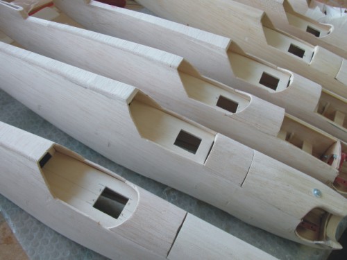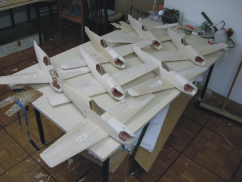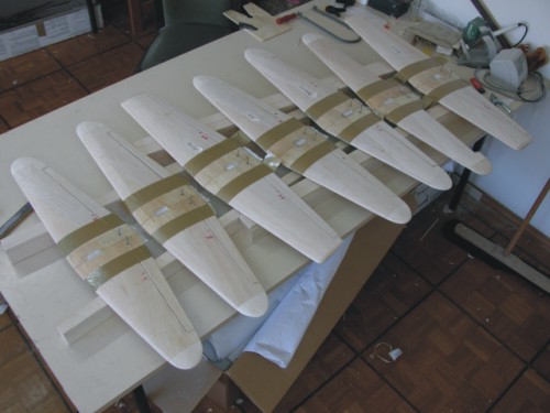 | Freitag, 17 Abend - Johannes und Julian kommen etwas später und wird sind seit einiger Zeit mal wieder alle vollzählig. Beide sind erstaunt über der Fertigungsstand ihrer Modelle. Die Produktion läuft bei uns schon auf vollen Touren. Das Glasseideband wird leicht glatt geschliffen und anschießend das Paketband entfernt. Das überstehende Gewebe wird abgeschnitten und die Bohrungen für Tragflächenbefestigung und Dübel wieder gebohrt. Ich klebe alle Rudermaschinenbretter in die Rümpfe. Dominik, Alex und Yannick vermessen selbstständig den Einstellwinkel von Tragfläche und Leitwerk. Danach wird das Höhenleitwerk auf den Rumpf aufgeklebt. Aus den letzten Bauaktionen wissen die 3 wie das Leitwerk, mit einer Schnur zur Rumpfnase hin vermessen wird. Die Leitwerke von Johannes, Julian und meine werden bügelfertig vorbereitet. Als Verstärkung der Höhenruder verwenden wir, entgegen den Empfehlungen im Bauplan eine Verstärkung aus Kohlefaser 3x1mm. Diese wird in das Höhenruder eingelassen und mit Epoxy eingeklebt. Es steht nichts hervor und die Ruder lassen sich besser bespannen. Nächsten Dienstag wollen wir (Johannes, Julian und ich) eine Sonderschicht einlegen. Somit werden wir den gleichen Fertigungsstand erreichen wie die drei führenden. Dies wird schwer, den Yannick und Alexander haben schon Ihre Tragflächen und etwas Folie mitgenommen. Bis zum nächsten Abend wollen sie die Tragflächen mit Gewebefolie bespannen. | |