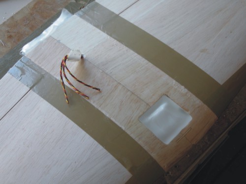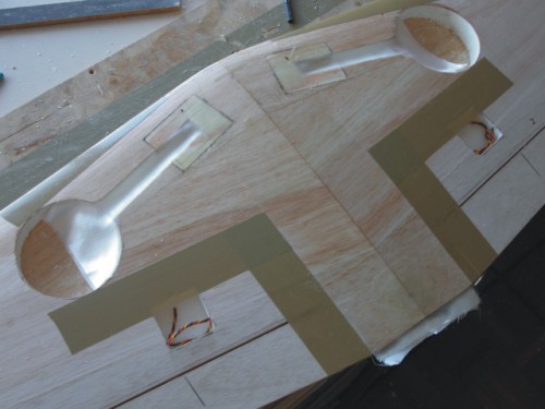 | Samstag, und ein Gewitter zieht übers Land. Ich bin in den Bauräumen. Die Aussparung für die Rudermaschine vom Einziehfahrwerk wird mit der Oberfräse angebracht. Die Durchbrüche für Gestänge werden herausgefeilt. Dann wird im Verlauf vom Glasgewebe mit Paketband abgeklebt. Ein Steifen, 105-Gramm Glasgewebe, so breit wie der Rumpf wird um die Nasenleiste gezogen und oben und unten bis zur Endleiste hin aufgebracht. Dann folgt ein zweiter Streifen quer bis zu den Radschächten hin. Abschließend wird im Bereich der Befestigungsschraube noch mit 5 Lagen Gewebe verstärkt. Der Flügel wird auf die Seite gestellt. An der vorderen Rumpfabdeckung wird noch ein Schnellverschluss montiert und gegen Abend die am letzten Wochenende beschädigte Extra repariert. Dann knurrt auch schon wieder der Magen und es ist Zeit nach Hause zu gehen. | |