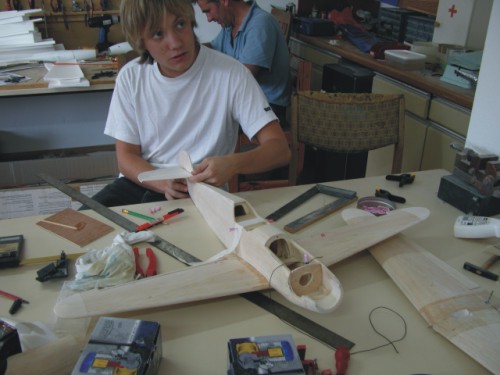 | Donnerstag, 15. Abend. Den Mittag über waren wir auf dem Modellflugplatz. Direkt vom Flugplatz aus geht es weiter in die Bauräume. Alex, Dominik, Yannick und ich halten heute Abend die Stellung. Die älteren zwei bügeln die Höhenleitwerke mit Textilfolie. Als Scharnierband verwenden sie einen 20 mm breiten Streifen aus Gewebefolie. Dies hat sich schon bei den letzten Aircombat - Aktion im Jahr 2002 so bewährt. Bei den noch heilen Modellen hält dies noch heute wie am ersten Tag. Yannick und ich bauen derweilen die restlichen Tragflächen weiter. Die 5mm Flächendübel werden verbohrt und anschießend montiert. Die genaue Lage vom Flügel wird vermessen. Dies geschieht mit einer am Rumpfhinterteil befestigten Schnur. Der Abstand zu den Enden der Tragflächen sollte auf beiden Seiten gleich sein. Wenn die Lage stimmt wird die Bohrung für die Nylonschraube gebohrt, durch Flügel und Rumpf zugleich. Die Einschlagmuttern im Rumpf werden montiert und mit Uhu-Plus Endfest 300 eingeklebt. Kleinere Nacharbeiten werden erledigt und schon wieder ist es 20 Uhr. Wie im Fluge ist heute wieder die Zeit vergangen. Abschießend wird noch ein bisschen aufgeräumt und ein Paar Schnappschüsse für das Internet festgehalten. Danach sind wir hungrig und begeben uns zum Italiener. | |